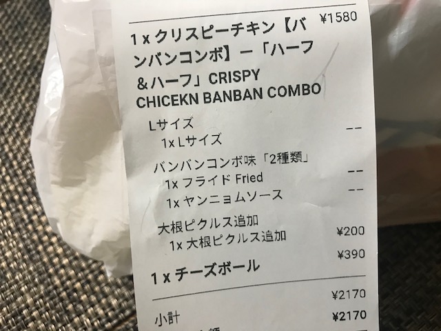 반반치킨에 무 치즈볼 추가해서 2170엔이다.