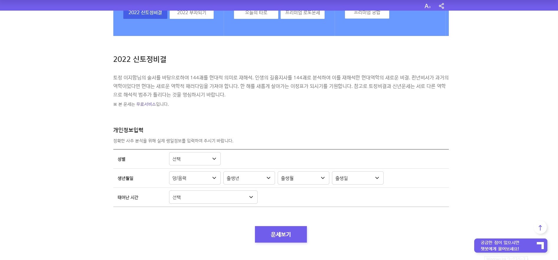 2022년 올해 토정비결 메뉴는 세번째에 있어요.
