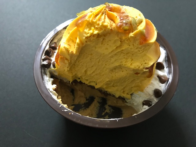 노란 크림이 잔뜩 올려져 있고 그위에 쿠로미츠랑 피스타치오가 뿌려져 있다.
