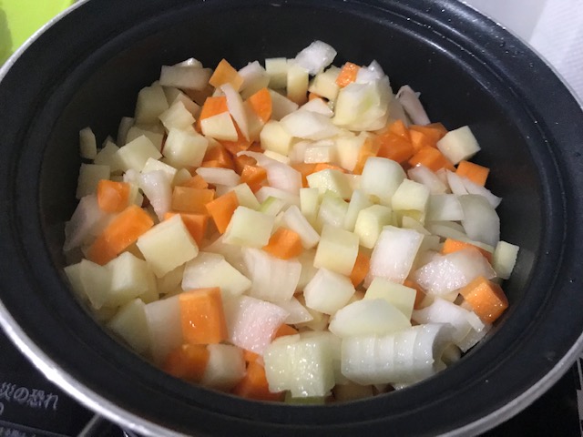 먼저 당근, 감자, 양파를 올리브유 살짝 두르고 볶아 주세요.