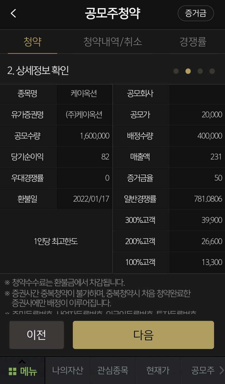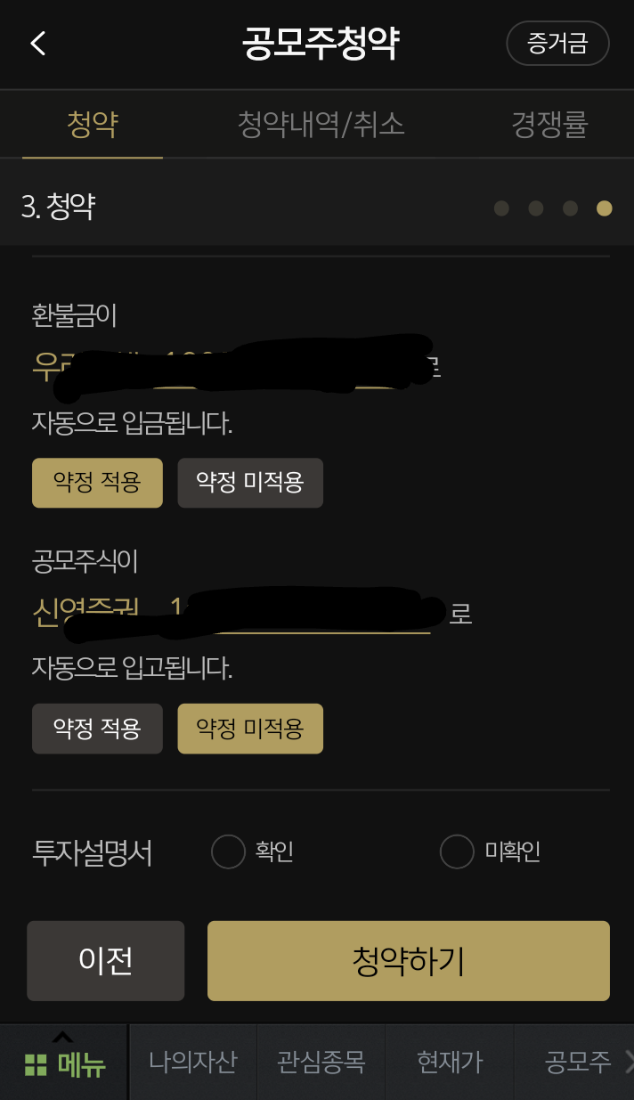 그럼 환불금 계좌랑 공모주식이 들어올 계좌를 선택할 수 있어요.