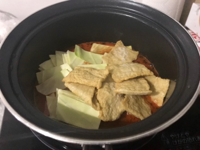 냄비에 물이랑 스프랑 어묵 양배추 다 넣고 끓이기!
